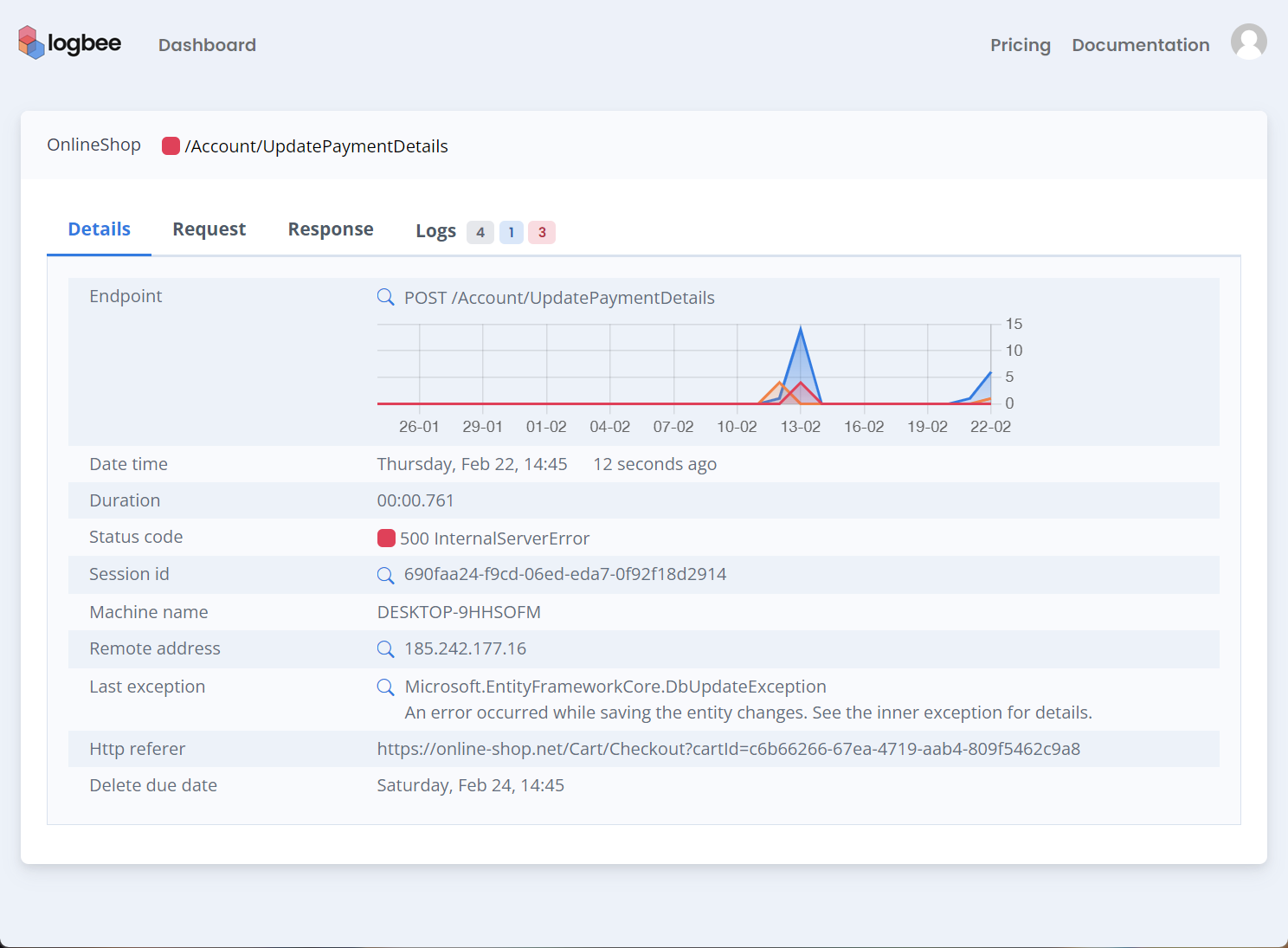 logbee.net stores all HTTP requests individually, alongside all their related logs, in the order as they occurred. See every request as a complete story.